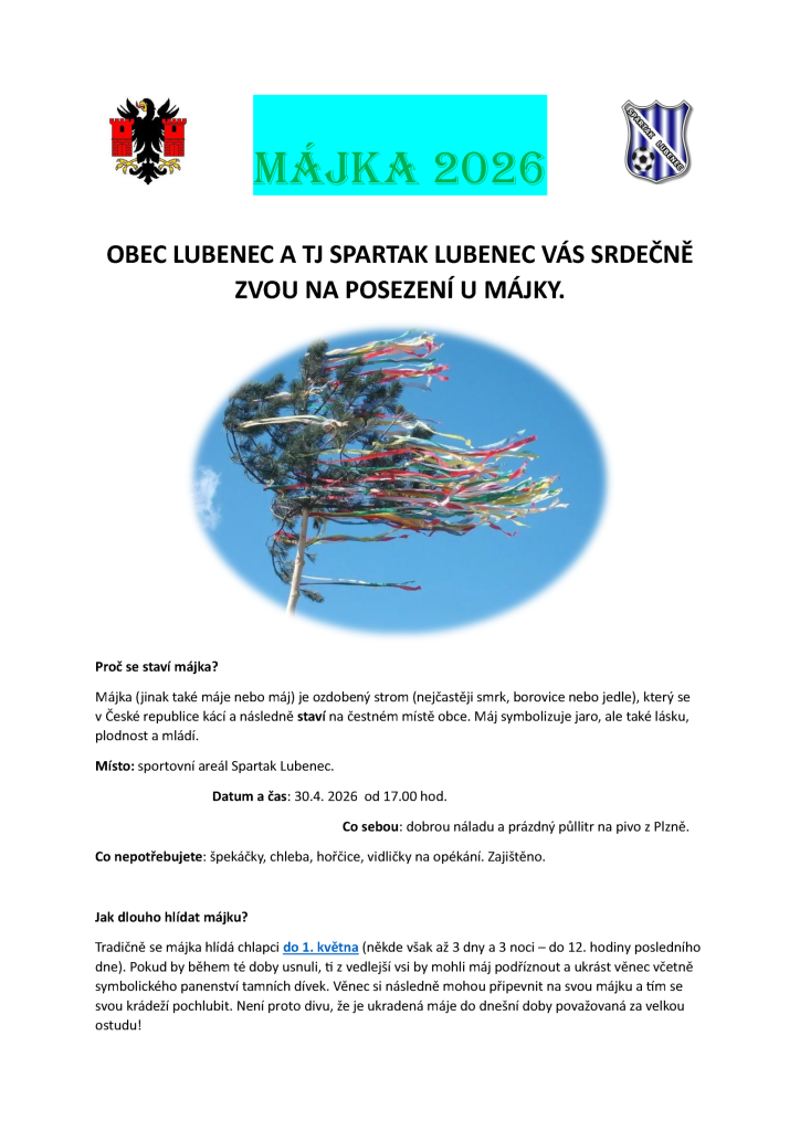 Obec Lubenec a TJ Spartak Lubenec vás zvou na tradiční posezení u májky. Akce se uskuteční 30. dubna 2026 od 17:00 hodin ve sportovním areálu Spartak Lubenec.